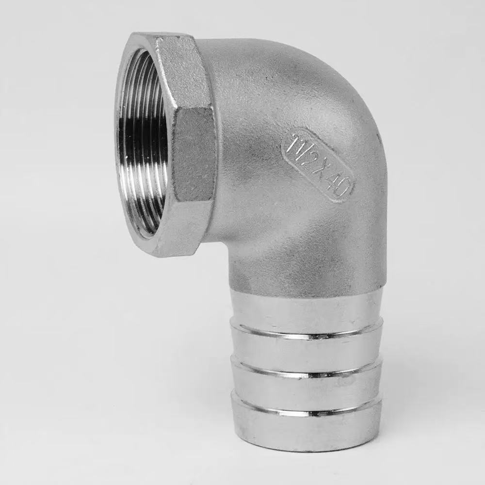 90 డిగ్రీ ఫిమేల్ థ్రెడ్ ఎల్బో ఫిట్టింగ్:ఒక చివర ఆడ థ్రెడ్ మరియు మరొక వైపు ముళ్ల గొట్టం అమర్చడం, మగ-థ్రెడ్ భాగాలకు కనెక్షన్ కోసం రూపొందించబడింది.